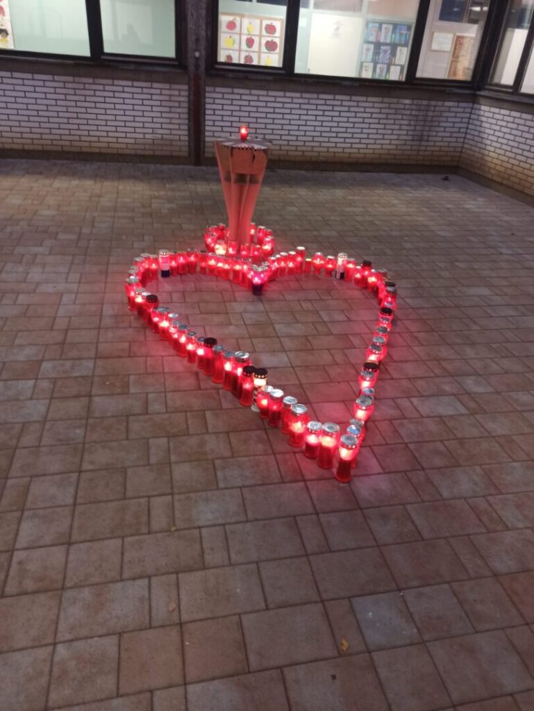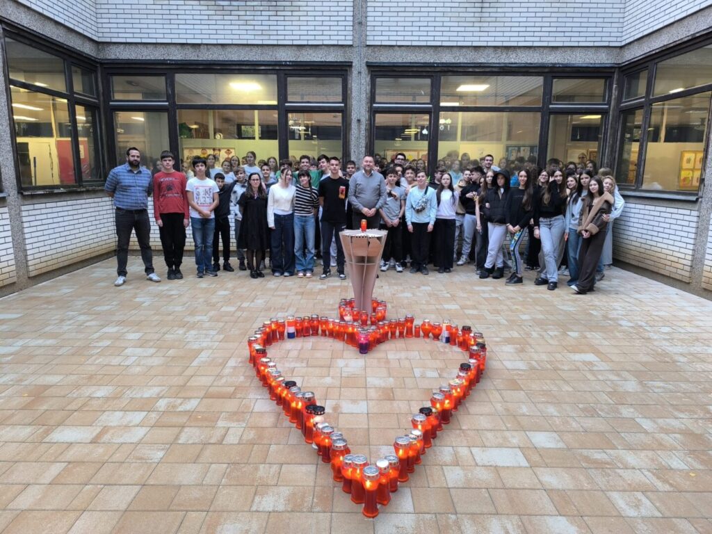 Nakon priredbe učenici su osmih razreda zajedno s učiteljima upalili svijeće u atriju škole,