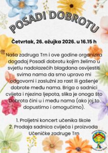 Dana 10. ožujka u 5.d razrednom odjelu održana je radionica u sklopu projekta „Odgovornom potrošnjom do bolje klime“, Udruge DOOR. Cilj radionice bio je podizanje svijesti o važnosti odgovorne potrošnje energije i očuvanja okoliša. Učenici… Read more: Zelena škola