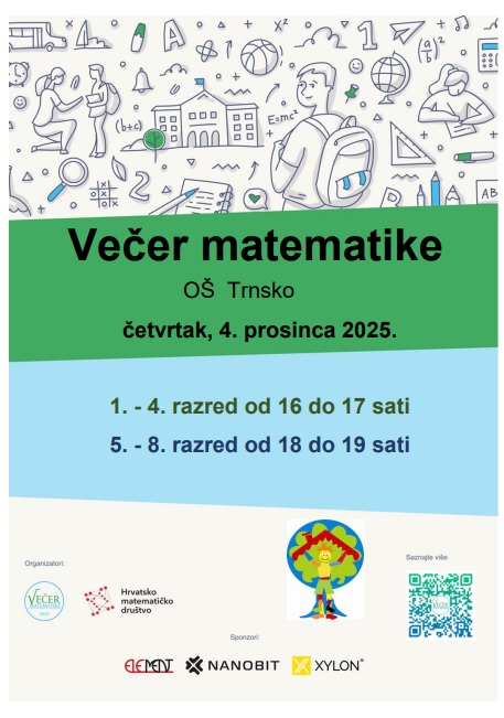 Dragi učenici i poštovani roditelji, s velikim zadovoljstvom vas pozivamo na Večer matematike, koja će se održati u četvrtak, 4. prosinca, u prostorima naše škole. Ovo druženje osmišljeno je kako bi učenici zajedno s roditeljima otkrivali matematiku na jedan opušten,...