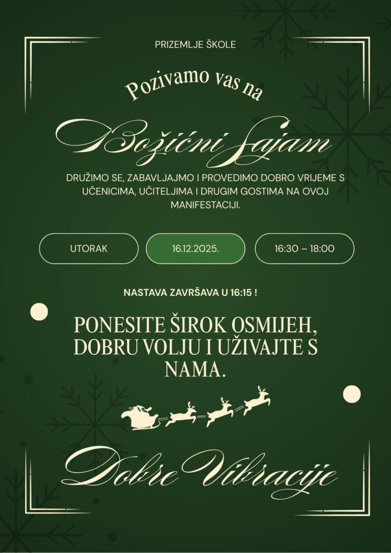 Dragi roditelji i prijatelji, pozivamo vas na božićni sajam koji će se održati u utorak 16. prosinca od 16:30 do 18 sati. Veselimo se vašem dolasku i zajedničkom druženju uz pjesmu i veselje.