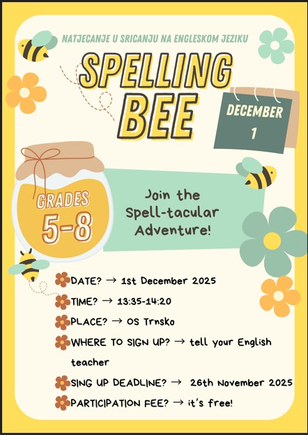 U utorak, 4. ožujka 2025., u OŠ Jelkovec održano je županijsko natjecanje iz engleskog jezika na koje su se nakon školskog natjecanja plasirale učenice Galina Micevski, 8.d (mentor prof. Marko Fijan) i Viktoria Rožman, 8.b (mentorica prof. Nikolina Reder)....