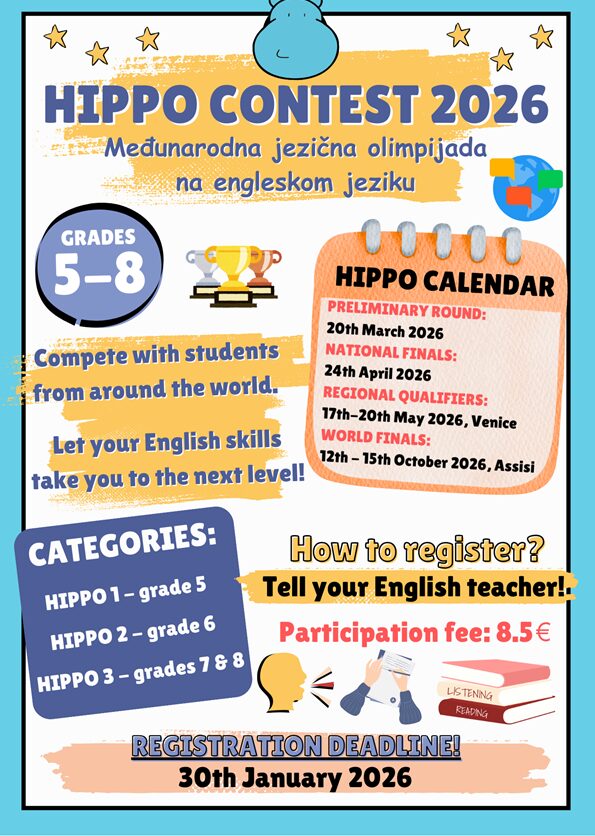 Dragi učenici, ovim putem pozivamo sve zainteresirane da se prijave na HIPPO 2026 natjecanje, međunarodnu olimpijadu iz engleskog jezika. Tko se može prijaviti? Prijaviti se mogu učenici od 5. do 8. razreda u 3 kategorije:HIPPO 1 - 5. razred HIPPO 2 - 6. razred HIPPO 3 - 7. i 8. razred Kada će se...